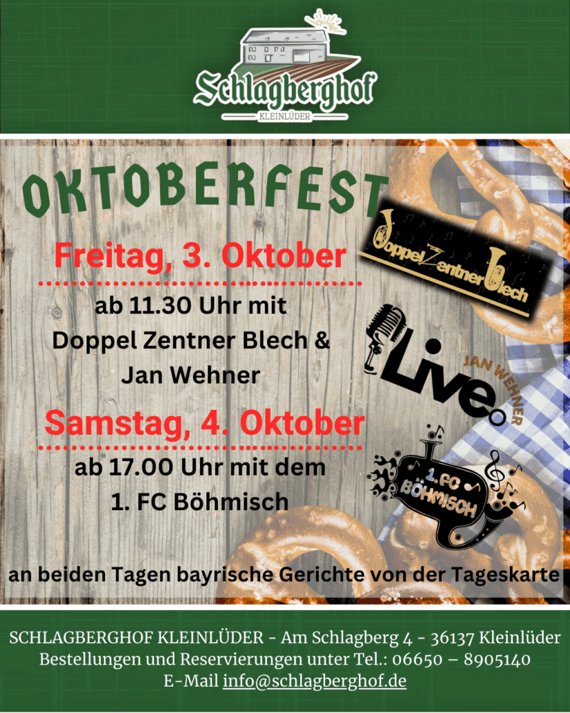Oktoberfest 2025Startdatum: 3. Oktober 2025Enddatum: 4. Oktober 2025Uhrzeit: 11:30Oktoberfest 2025 Freitag, 3. Oktober ab 11.30 Uhr und Samstag, 4. Oktober ab 17.00 Uhr 26. September 2025 https://schlagberghof.de/wp-content/uploads/2025/09/Flyer-30.08.2025-3.png 1350 1080 jschoenherr https://schlagberghof.de/wp-content/uploads/2023/11/schlagberghog-logo-2023.png jschoenherr2025-09-26 14:49:282025-09-26 14:49:28Oktoberfest 2025